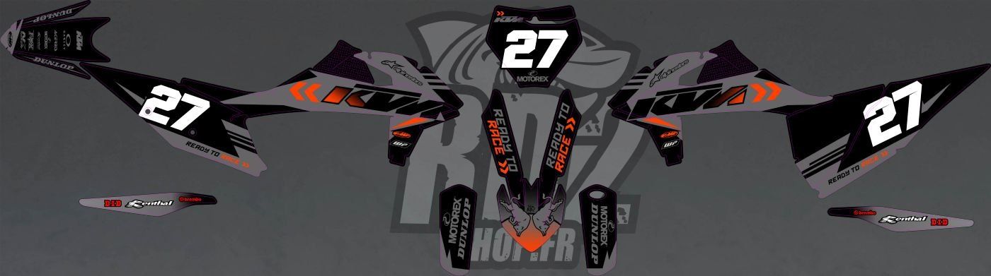 Kit Déco autocollant complet Semi-perso RB GRIS NOIR pour motocross , supermotard KTM : 125, 150 , 250 , 300 ,350 , 450 SX / SXF / EXC Année : , 2003 à 2026 . Autocollants épais haute qualité .