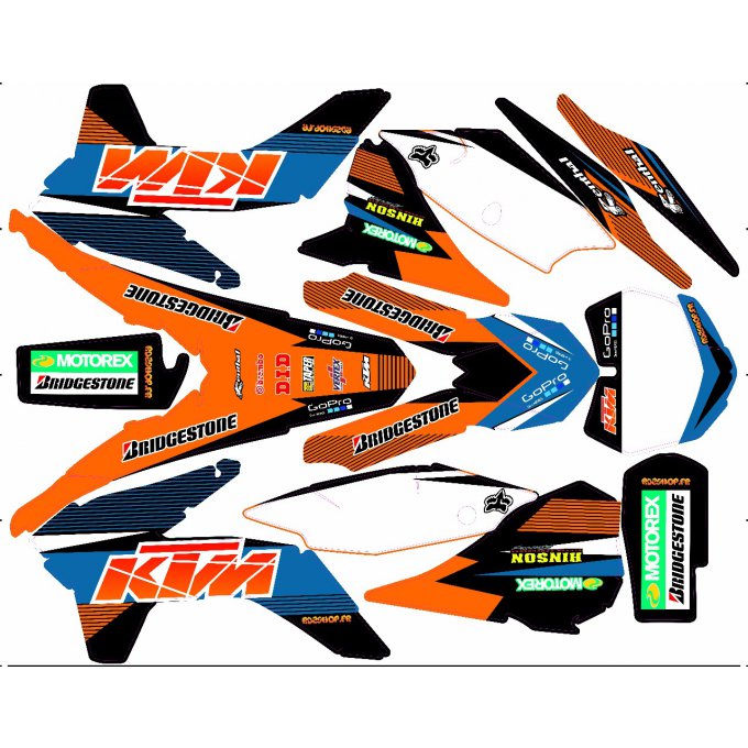 Kit Déco autocollant complet Semi-perso pour motocross , supermotard KTM : 125, 150 , 250 , 350 , 450 SX / SXF / EXC Année : 2011 ,2012 , 2013 , 2014 , 2015 , 2016 , 2017 , 2018 , 2019 . Autocollants épais haute qualité .