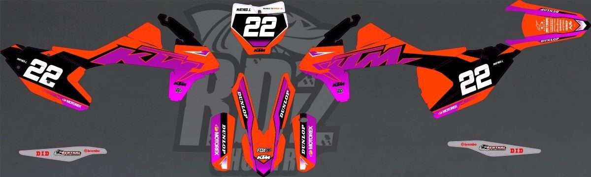 Kit Déco autocollant complet Semi-perso Orange violet rose pour motocross , supermotard KTM : 125, 150 , 250 , 300 ,350 , 450 SX / SXF / EXC Année : , 2023 à 2026 . Autocollants épais haute qualité . Personnalisation offerte .