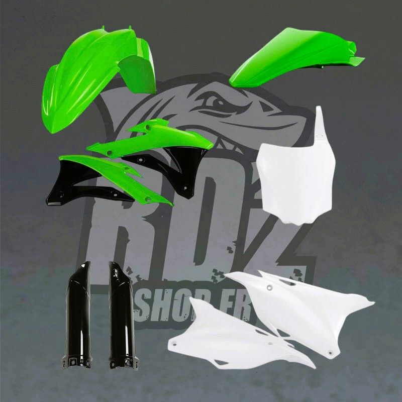 Kit Plastiques Vert Blanc Noir KAWASAKI KX85 2014 à 2021 avec bas de fourche noir