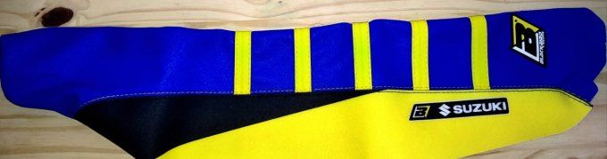 Housse de selle bande bleu et jaune / noir . Cet article est compatible pour : SUZUKI RMZ 250 ( 2007 à 2018 )